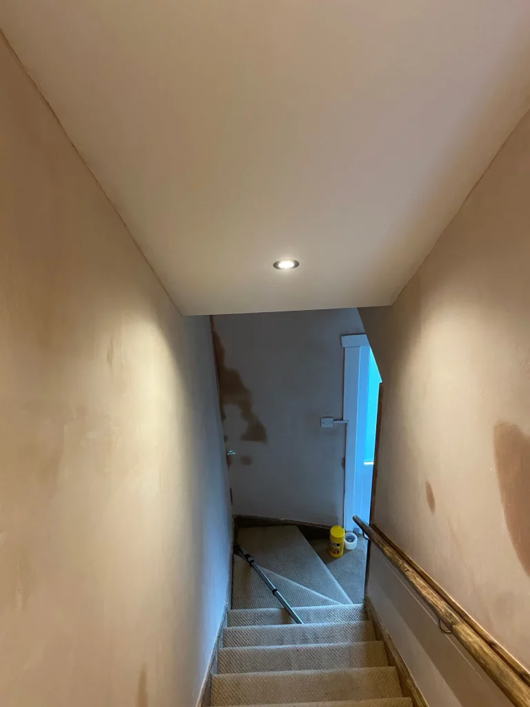 Expertly plastered staircase area with crisp lines and a flawless surface